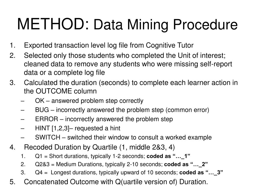 METHOD: Data Mining Procedure • Exported transaction level log file from Cognitive Tutor • Selected only those students who completed the Unit of interest; cleaned data to remove any students who were missing self-report data or a complete log file • Calculated the duration (seconds) to complete each learner action in the OUTCOME column • OK – answered problem step correctly • BUG – incorrectly answered the problem step (common error) • ERROR – incorrectly answered the problem step • HINT [1,2,3]– requested a hint • SWITCH – switched their window to consult a worked example • Recoded Duration by Quartile (1, middle 2&3, 4) • Q1 = Short durations, typically 1-2 seconds; coded as “…_1” • Q2&3 = Medium Durations, typically 2-10 seconds; coded as “…_2” • Q4 = Longest durations, typically upward of 10 seconds; coded as “…_3” • Concatenated Outcome with Q(uartile version of) Duration.
