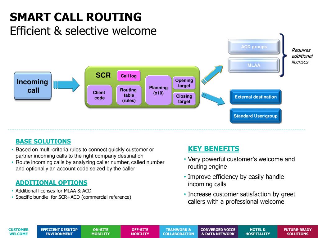 Call log SCR Planning(x10) Opening target Client code Routing table(rules) Closing target Incoming call SMART CALL ROUTINGEfficient & selective welcome ACD groups Requires additional licenses MLAA External destination Standard User/group • BASE SOLUTIONS • Based on multi-criteria rules to connect quickly customer or partner incoming calls to the right company destination • Route incoming calls by analyzing caller number, called number and optionally an account code seized by the caller • ADDITIONAL OPTIONS • Additional licenses for MLAA & ACD • Specific bundle for SCR+ACD (commercial reference) • KEY BENEFITS • Very powerful customer’s welcome and routing engine • Improve efficiency by easily handle incoming calls • Increase customer satisfaction by greet callers with a professional welcome CUSTOMER WELCOME EFFICIENT DESKTOP ENVIRONMENT ON-SITE MOBILITY OFF-SITE MOBILITY TEAMWORK & COLLABORATION CONVERGED VOICE & DATA NETWORK HOTEL & HOSPITALITY FUTURE-READY SOLUTIONS