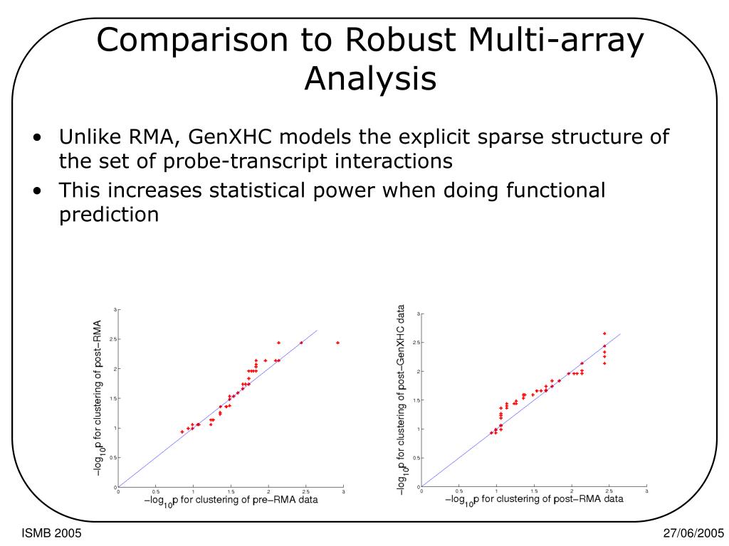 Comparison to Robust Multi-array Analysis • Unlike RMA, GenXHC models the explicit sparse structure of the set of probe-transcript interactions • This increases statistical power when doing functional prediction ISMB 2005
