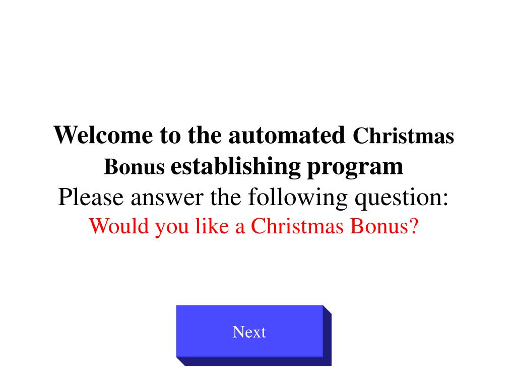 Welcome to the automated Christmas Bonus establishingprogramPlease answer the following question: Would you like a Christmas Bonus? Next