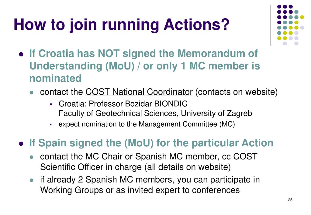 How to join running Actions? • If Croatia has NOT signed the Memorandum of Understanding (MoU) / or only 1 MC member is nominated • contact the COST National Coordinator (contacts on website) • Croatia: Professor Bozidar BIONDICFaculty of Geotechnical Sciences, University of Zagreb • expect nomination to the Management Committee (MC) • If Spain signed the (MoU) for the particular Action • contact the MC Chair or Spanish MC member, cc COST Scientific Officer in charge (all details on website) • if already 2 Spanish MC members, you can participate in Working Groups or as invited expert to conferences