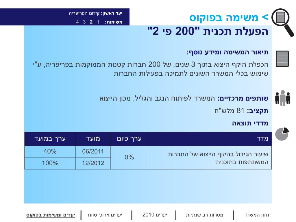 > משימה בפוקוסהפעלת תכנית "200 פי 2" יעד ראשון: קידום הפריפריה משימות:1 2 3 4 תיאור המשימה ומידע נוסף: הכפלת היקף היצוא בתוך 3שנים,של 200 חברות קטנות הממוקמות בפריפריה, ע"י שימוש בכלי המשרד השונים לתמיכה בפעילות החברות שותפים מרכזיים: המשרד לפיתוח הנגב והגליל, מכון הייצוא תקציב: 81 מלש"ח מדדי תוצאה יעדים ומשימות בפוקוס יעדים ארוכי טווח יעדים 2010 מטרות רב שנתיות חזון המשרד