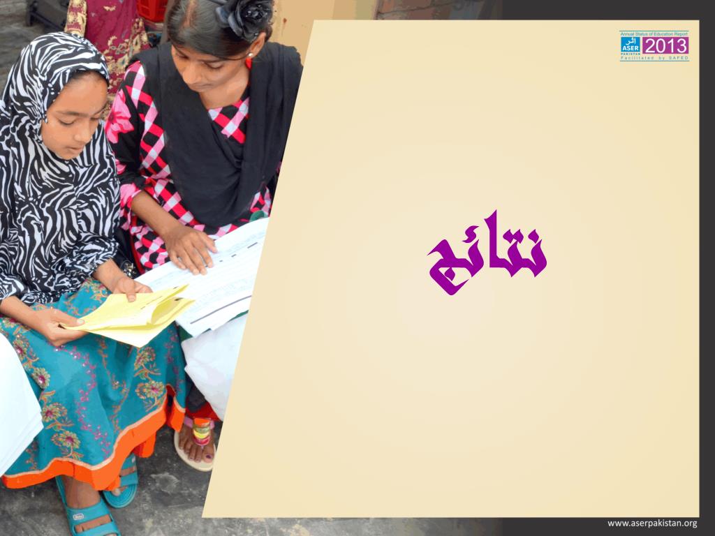 (Scale of the Survey) سروے کی حدود / وسعت 36 دیہی اضلاع 4 شہر ی اضلاع 22،704گھرانے|1،141 دیہات | 1،928 سکول|62،634بچے(16-3 سال) شہری اضلا ع: لا ہور، ملتا ن، رحیم یا ر خا ں اور فیصل آباد