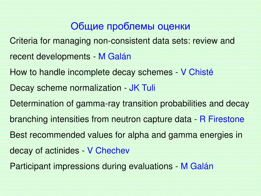 Общие проблемы оценки Criteria for managing non-consistent data sets: review and recent developments - M GalánHow to handle incomplete decay schemes - V Chisté Decay scheme normalization - JK Tuli Determination of gamma-ray transition probabilities and decay branching intensities from neutron capture data - R Firestone Best recommended values for alpha and gamma energies in decay of actinides - V Chechev Participant impressions during evaluations - M Galán