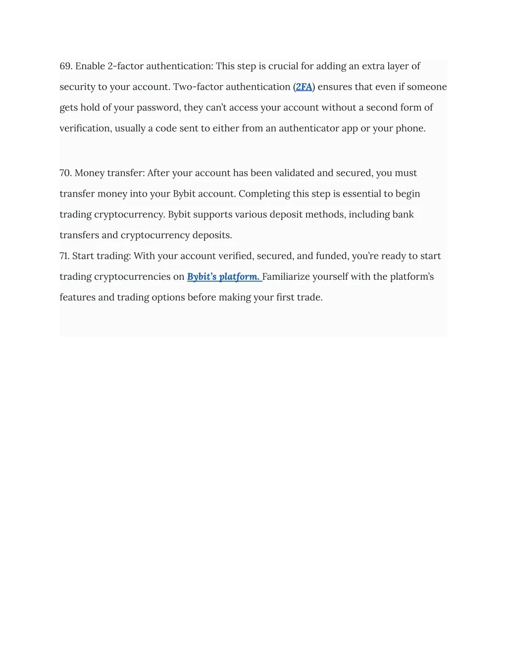 69. Enable 2-factor authentication: This step is crucial for adding an extra layer of security to your account. Two-factor authentication (2FA) ensures that even if someone gets hold of your password, they can’t access your account without a second form of verification, usually a code sent to either from an authenticator app or your phone. 70. Money transfer: After your account has been validated and secured, you must transfer money into your Bybit account. Completing this step is essential to begin trading cryptocurrency. Bybit supports various deposit methods, including bank transfers and cryptocurrency deposits. 71. Start trading: With your account verified, secured, and funded, you’re ready to start trading cryptocurrencies on Bybit’s platform. Familiarize yourself with the platform’s features and trading options before making your first trade.