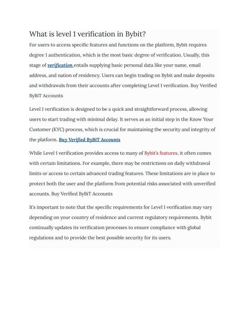 What is level 1 verification in Bybit? For users to access specific features and functions on the platform, Bybit requires degree 1 authentication, which is the most basic degree of verification. Usually, this stage of verification entails supplying basic personal data like your name, email address, and nation of residency. Users can begin trading on Bybit and make deposits and withdrawals from their accounts after completing Level 1 verification. Buy Verified ByBiT Accounts Level 1 verification is designed to be a quick and straightforward process, allowing users to start trading with minimal delay. It serves as an initial step in the Know Your Customer (KYC) process, which is crucial for maintaining the security and integrity of the platform. Buy Verified ByBiT Accounts While Level 1 verification provides access to many of Bybit’s features, it often comes with certain limitations. For example, there may be restrictions on daily withdrawal limits or access to certain advanced trading features. These limitations are in place to protect both the user and the platform from potential risks associated with unverified accounts. Buy Verified ByBiT Accounts It’s important to note that the specific requirements for Level 1 verification may vary depending on your country of residence and current regulatory requirements. Bybit continually updates its verification processes to ensure compliance with global regulations and to provide the best possible security for its users.