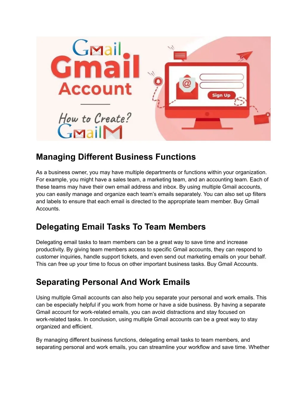 Managing Different Business Functions As a business owner, you may have multiple departments or functions within your organization. For example, you might have a sales team, a marketing team, and an accounting team. Each of these teams may have their own email address and inbox. By using multiple Gmail accounts, you can easily manage and organize each team’s emails separately. You can also set up filters and labels to ensure that each email is directed to the appropriate team member. Buy Gmail Accounts. Delegating Email Tasks To Team Members Delegating email tasks to team members can be a great way to save time and increase productivity. By giving team members access to specific Gmail accounts, they can respond to customer inquiries, handle support tickets, and even send out marketing emails on your behalf. This can free up your time to focus on other important business tasks. Buy Gmail Accounts. Separating Personal And Work Emails Using multiple Gmail accounts can also help you separate your personal and work emails. This can be especially helpful if you work from home or have a side business. By having a separate Gmail account for work-related emails, you can avoid distractions and stay focused on work-related tasks. In conclusion, using multiple Gmail accounts can be a great way to stay organized and efficient. By managing different business functions, delegating email tasks to team members, and separating personal and work emails, you can streamline your workflow and save time. Whether