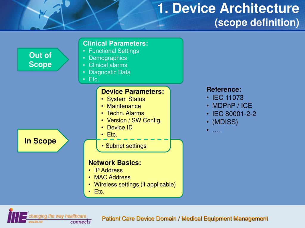 1. Device Architecture(scope definition) • Clinical Parameters: • Functional Settings • Demographics • Clinical alarms • Diagnostic Data • Etc. Out of Scope • Reference: • IEC 11073 • MDPnP / ICE • IEC 80001-2-2 • (MDISS) • …. • Device Parameters: • System Status • Maintenance • Techn. Alarms • Version / SW Config. • Device ID • Etc. In Scope • Network Basics: • IP Address • MAC Address • Wireless settings (if applicable) • Etc. • Subnet settings