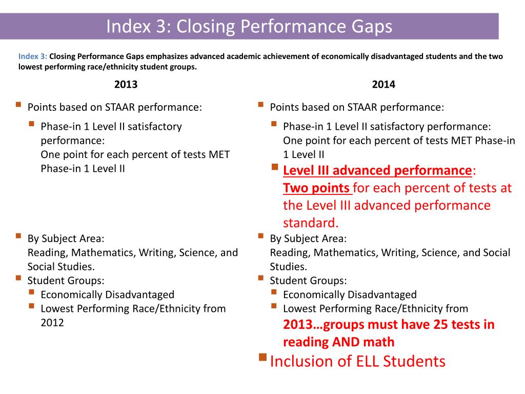 Index 3: Closing Performance Gaps Index 3: Closing Performance Gaps emphasizes advanced academic achievement of economically disadvantaged students and the two lowest performing race/ethnicity student groups. • 2013 • Pointsbased on STAAR performance: • Phase-in 1 Level II satisfactory performance: One point for each percent of tests MET Phase-in 1 Level II • By Subject Area: Reading, Mathematics, Writing, Science, and Social Studies. • Student Groups: • Economically Disadvantaged • Lowest Performing Race/Ethnicity from 2012 • 2014 • Pointsbased on STAAR performance: • Phase-in 1 Level II satisfactory performance: One point for each percent of tests MET Phase-in 1 Level II • Level III advanced performance:Two points for each percent of tests at the Level III advanced performance standard. • By Subject Area: Reading, Mathematics, Writing, Science, and Social Studies. • Student Groups: • Economically Disadvantaged • Lowest Performing Race/Ethnicity from 2013…groups must have 25 tests in reading AND math • Inclusion of ELL Students