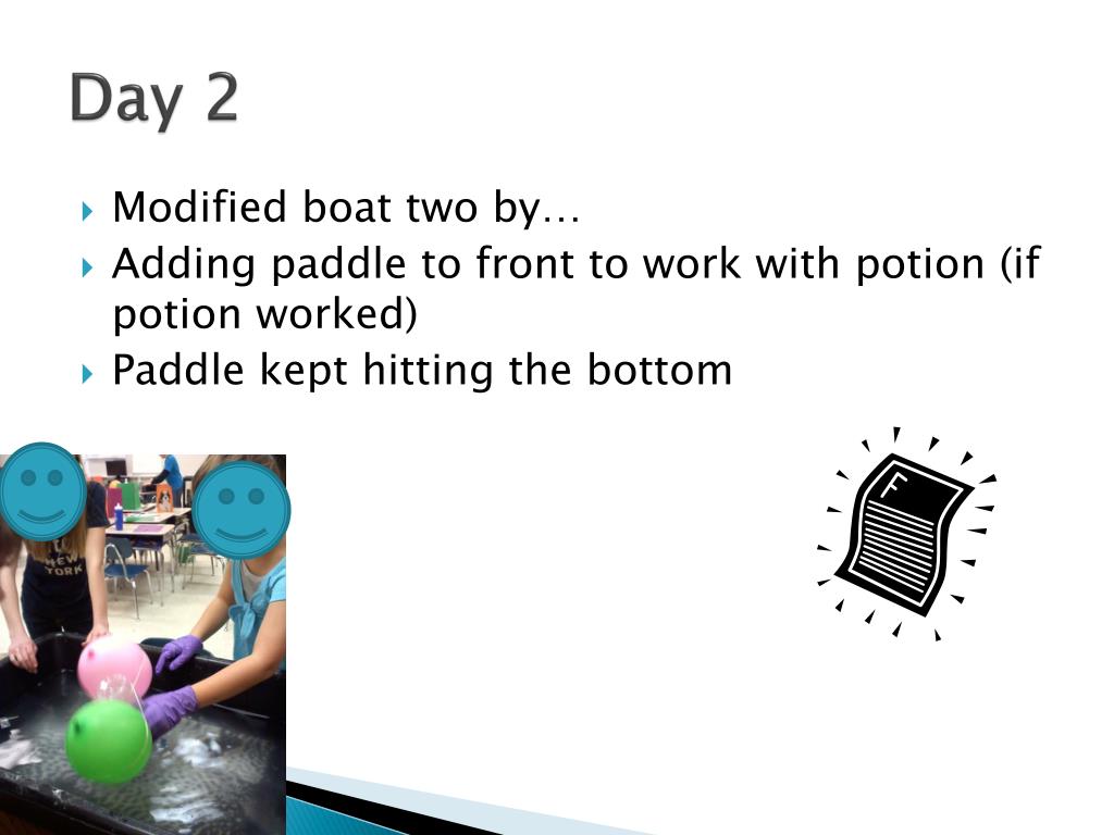 Day 1 • Our first boat: • It couldn’t float because… • The secret potion didn’t work • Balloons too big so it was pulling boat up, so cap wasn’t in water • To make it better we… • Added a paddle (fought against secret potion, if potion worked anyway)