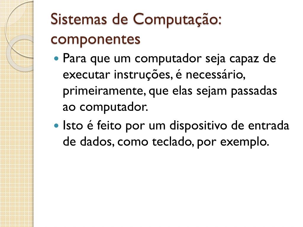 Sistemas de Computação: componentes • Para que um computador seja capaz de executar instruções, é necessário, primeiramente, que elas sejam passadas ao computador. • Isto é feito por um dispositivo de entrada de dados, como teclado, por exemplo.