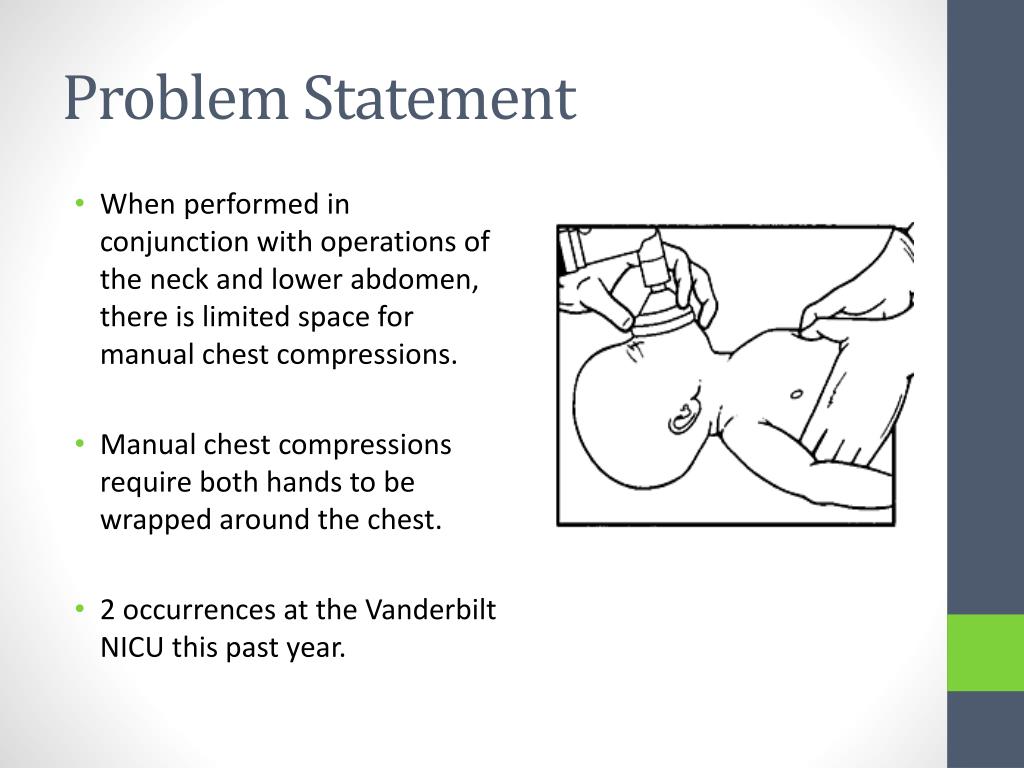 Problem Statement • When performed in conjunction with operations of the neck and lower abdomen, there is limited space for manual chest compressions. • Manual chest compressions require both hands to be wrapped around the chest. • 2 occurrences at the Vanderbilt NICU this past year.