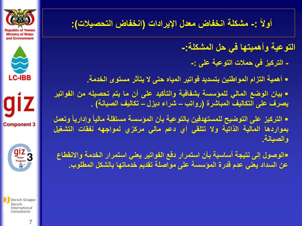 أولاً :- مشكلة انخفاض معدل الإيرادات(انخفاض التحصيلات): التوعية وأهميتها في حل المشكلة:- - التركيز في حملات التوعية على :- • أهمية التزام المواطنين بتسديد فواتير المياه حتى لا يتأثر مستوى الخدمة. • بيان الوضع المالي للمؤسسة بشفافية والتأكيد على أن ما يتم تحصيله من الفواتير يصرف على التكاليف المباشرة (رواتب – شراء ديزل – تكاليف الصيانة) . • التركيز على التوضيح للمستهدفين بالتوعية بأن المؤسسة مستقلة مالياً وإدارياً وتعمل بمواردها المالية الذاتية ولا تتلقي أي دعم مالي مركزي لمواجهه نفقات التشغيل والصيانة. • الوصول إلى نتيجة أساسية بأن استمرار دفع الفواتير يعني استمرار الخدمة والانقطاع عن السداد يعني عدم قدرة المؤسسة على مواصلة تقديم خدماتها بالشكل المطلوب.