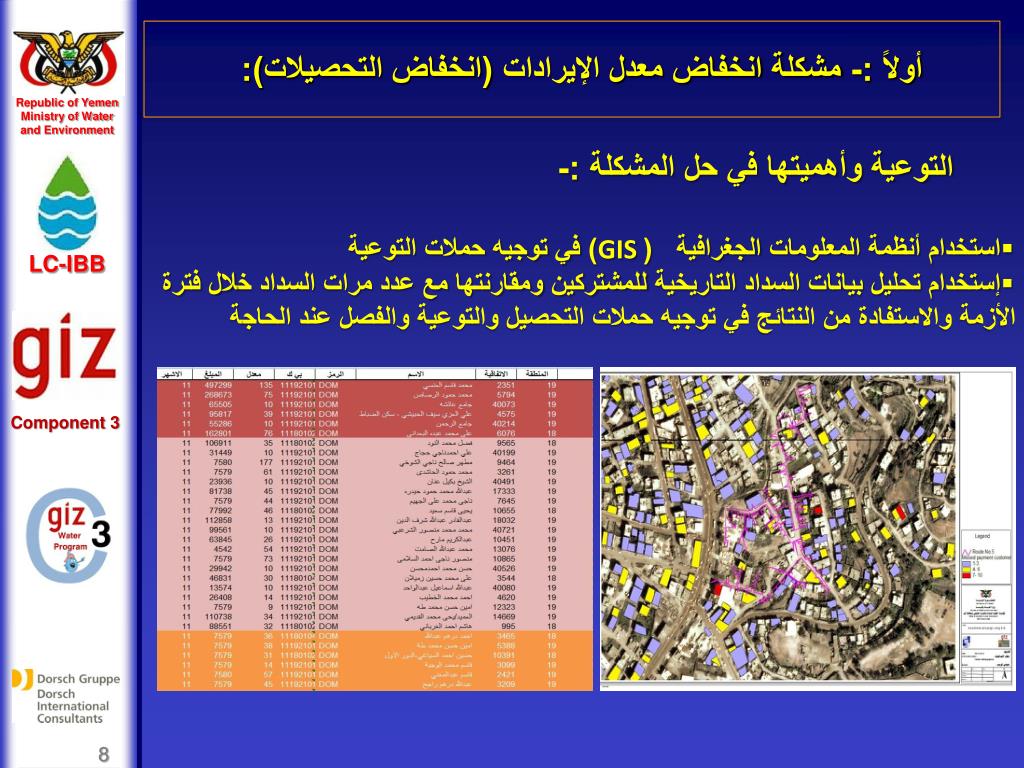 أولاً :- مشكلة انخفاض معدل الإيرادات(انخفاض التحصيلات): التوعية وأهميتها في حل المشكلة :- • استخدام أنظمة المعلومات الجغرافية (GIS ) في توجيه حملات التوعية • إستخدام تحليل بيانات السداد التاريخية للمشتركين ومقارنتها مع عدد مرات السداد خلال فترة الأزمة والاستفادة من النتائج في توجيه حملات التحصيل والتوعية والفصل عند الحاجة