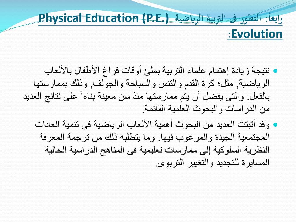 رابعاً: التطور فى التربية الرياضية Physical Education (P.E.) Evolution: • نتيجة زيادة إهتمام علماء التربية بملئ أوقات فراغ الأطفال بالألعاب الرياضية, مثل؛ كرة القدم والتنس والسباحة والجولف, وذلك بممارستها بالفعل. والتى يفضل أن يتم ممارستها منذ سن معينة بناءاً على نتائج العديد من الدراسات والبحوث العلمية القائمة. • وقد أثبتت العديد من البحوث أهمية الألعاب الرياضية فى تنمية العادات المجتمعية الجيدة والمرغوب فيها. وما يتطلبه ذلك من ترجمة المعرفة النظرية السلوكية إلى ممارسات تعليمية فى المناهج الدراسية الحالية المسايرة للتجديد والتغيير التربوى.