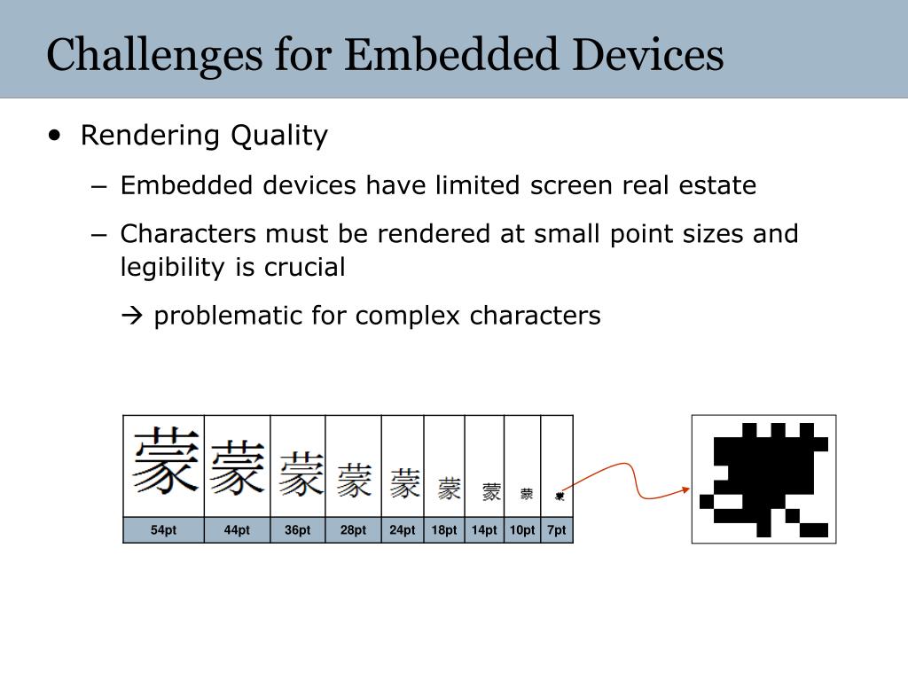 Challenges for Embedded Devices • Rendering Quality • Embedded devices have limited screen real estate • Characters must be rendered at small point sizes and legibility is crucial problematic for complex characters
