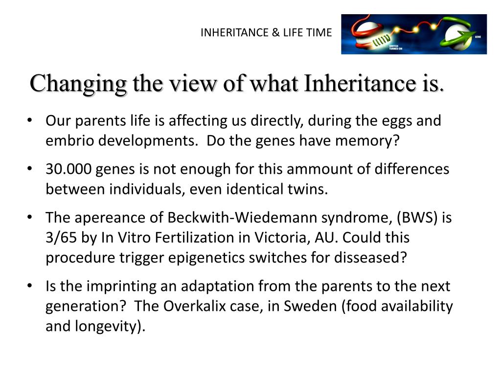 Changingtheview of whatInheritanceis. INHERITANCE & LIFE TIME • Ourparentslifeisaffectingusdirectly, duringtheeggs and embriodevelopments. Do the genes havememory? • 30.000 genes isnotenoughforthisammount of differencesbetweenindividuals, evenidenticaltwins. • Theapereance of Beckwith-Wiedemannsyndrome, (BWS)is 3/65 by In Vitro Fertilization in Victoria, AU. Couldthisproceduretriggerepigeneticsswitchesfordisseased? • Istheimprintinganadaptationfromtheparentstothenextgeneration? TheOverkalix case, in Sweden (foodavailability and longevity).