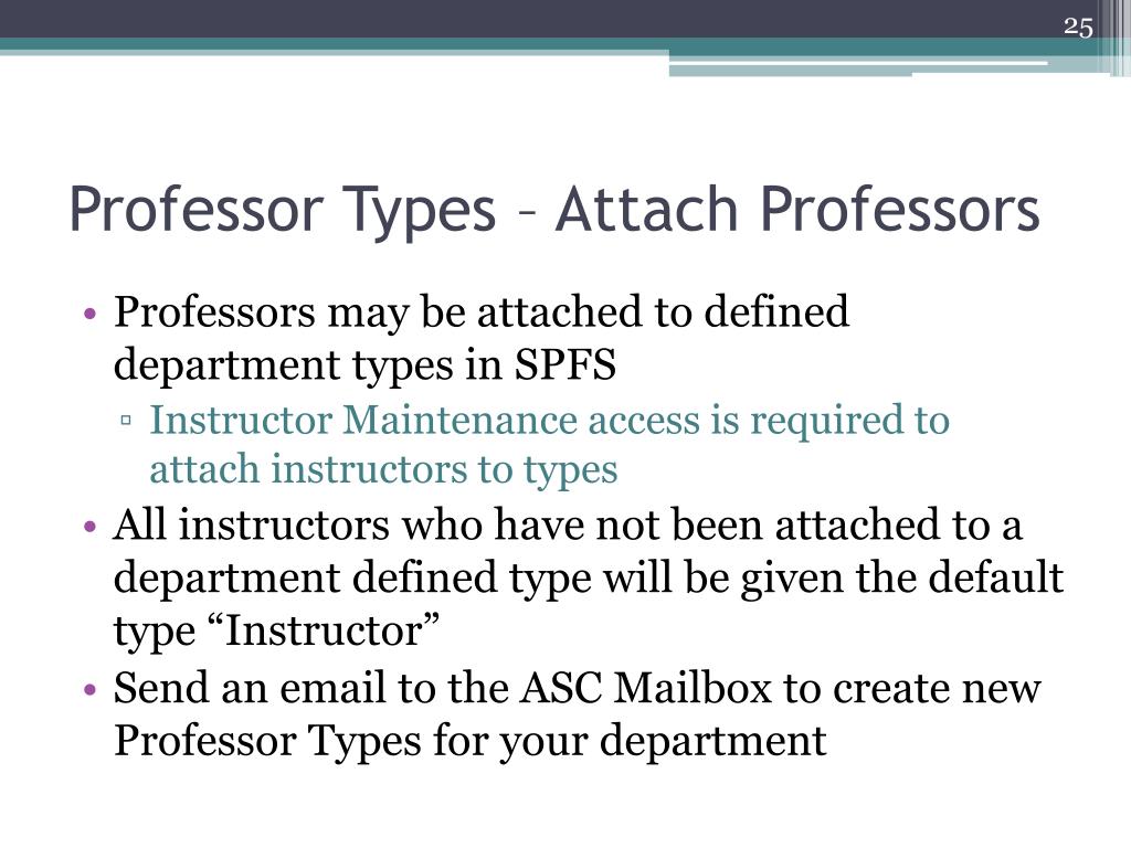 Professor Types – Attach Professors • Professors may be attached to defined department types in SPFS • Instructor Maintenance access is required to attach instructors to types • All instructors who have not been attached to a department defined type will be given the default type “Instructor” • Send an email to the ASC Mailbox to create new Professor Types for your department