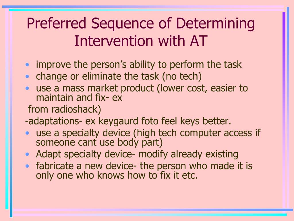 Preferred Sequence of Determining Intervention with AT • improve the person’s ability to perform the task • change or eliminate the task (no tech) • use a mass market product (lower cost, easier to maintain and fix- ex from radioshack) -adaptations- ex keygaurd foto feel keys better. • use a specialty device (high tech computer access if someone cant use body part) • Adapt specialty device- modify already existing • fabricate a new device- the person who made it is only one who knows how to fix it etc.