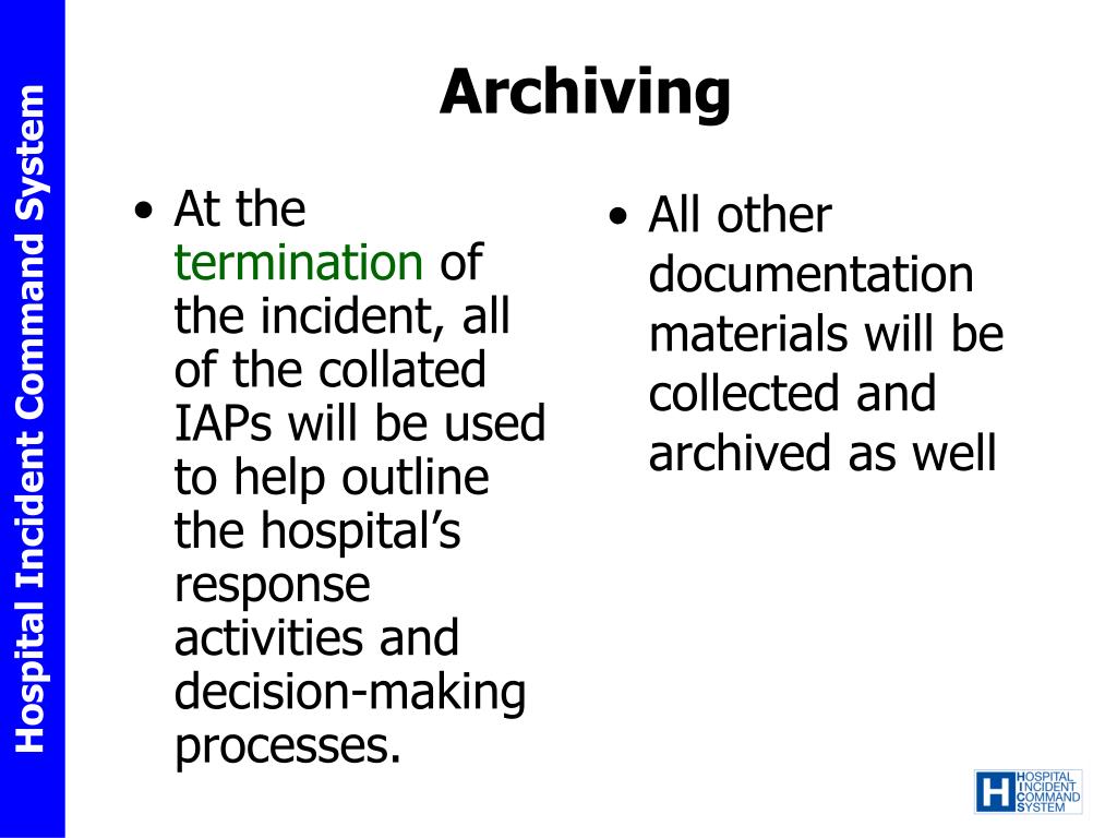 At the termination of the incident, all of the collated IAPs will be used to help outline the hospital’s response activities and decision-making processes. All other documentation materials will be collected and archived as well Archiving