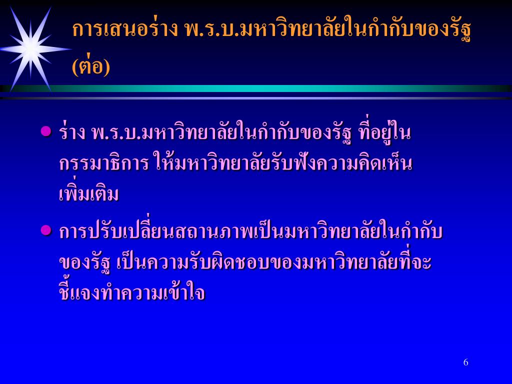 การเสนอร่าง พ.ร.บ.มหาวิทยาลัยในกำกับของรัฐ • เป็นอำนาจของสภามหาวิทยาลัยที่จะตัดสินใจ รัฐบาลมิได้เร่งรัดหรือมีกรอบระยะเวลา • ควรรับฟังความคิดเห็น และความเห็นพ้องจากบุคลากรทุกกลุ่ม จนได้ข้อยุติ • มหาวิทยาลัยใดเสนอร่าง พ.ร.บ. มหาวิทยาลัยในกำกับ มาแล้ว ให้รายงานผลการรับฟังความคิดเห็นและ ความเห็นพ้อง