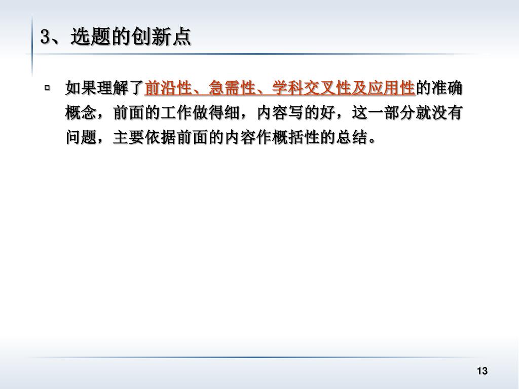 3、选题的创新点 如果理解了前沿性、急需性、学科交叉性及应用性的准确概念,前面的工作做得细,内容写的好,这一部分就没有问题,主要依据前面的内容作概括性的总结。