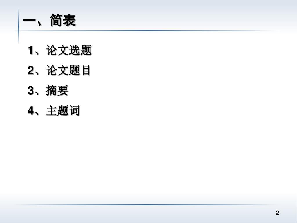 一、简表 1、论文选题 2、论文题目 3、摘要 4、主题词