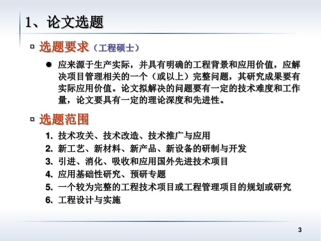 1、论文选题 选题要求(工程硕士) 应来源于生产实际,并具有明确的工程背景和应用价值,应解决项目管理相关的一个(或以上)完整问题,其研究成果要有实际应用价值。论文拟解决的问题要有一定的技术难度和工作量,论文要具有一定的理论深度和先进性。 选题范围 技术攻关、技术改造、技术推广与应用 新工艺、新材料、新产品、新设备的研制与开发 引进、消化、吸收和应用国外先进技术项目 应用基础性研究、预研专题 一个较为完整的工程技术项目或工程管理项目的规划或研究 工程设计与实施