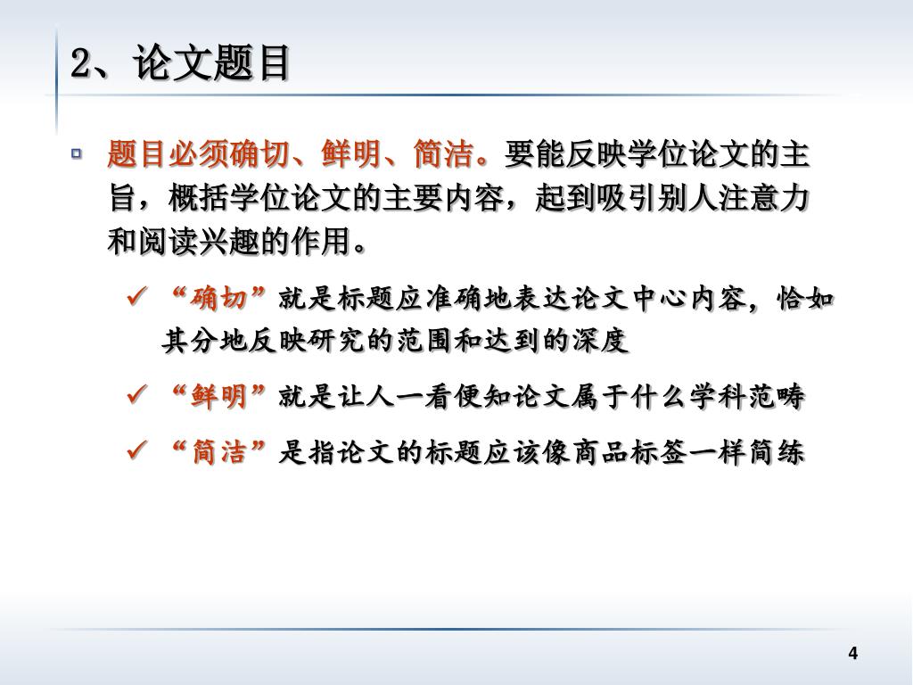 2、论文题目 题目必须确切、鲜明、简洁。要能反映学位论文的主旨,概括学位论文的主要内容,起到吸引别人注意力和阅读兴趣的作用。 “确切”就是标题应准确地表达论文中心内容,恰如其分地反映研究的范围和达到的深度 “鲜明”就是让人一看便知论文属于什么学科范畴 “简洁”是指论文的标题应该像商品标签一样简练