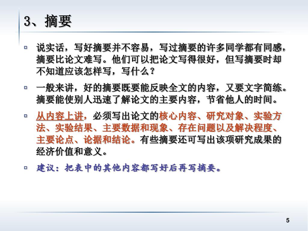 3、摘要 说实话,写好摘要并不容易,写过摘要的许多同学都有同感,摘要比论文难写。他们可以把论文写得很好,但写摘要时却不知道应该怎样写,写什么? 一般来讲,好的摘要既要能反映全文的内容,又要文字简练。摘要能使别人迅速了解论文的主要内容,节省他人的时间。 从内容上讲,必须写出论文的核心内容、研究对象、实验方法、实验结果、主要数据和现象、存在问题以及解决程度、主要论点、论据和结论。有些摘要还可写出该项研究成果的经济价值和意义。 建议:把表中的其他内容都写好后再写摘要。
