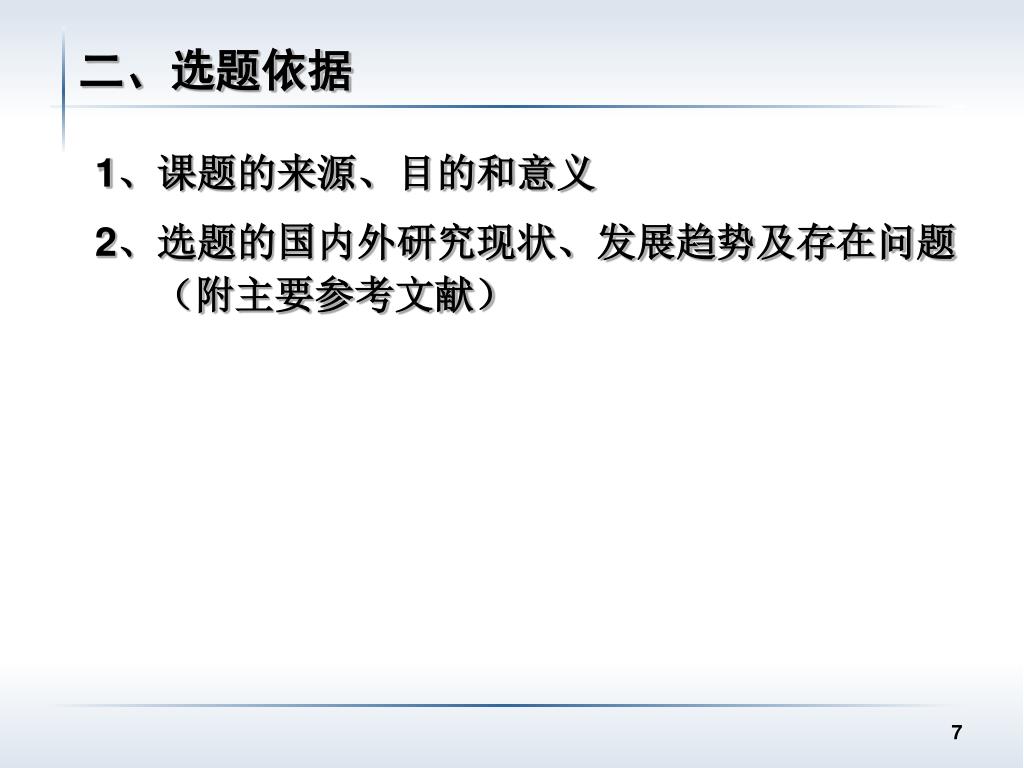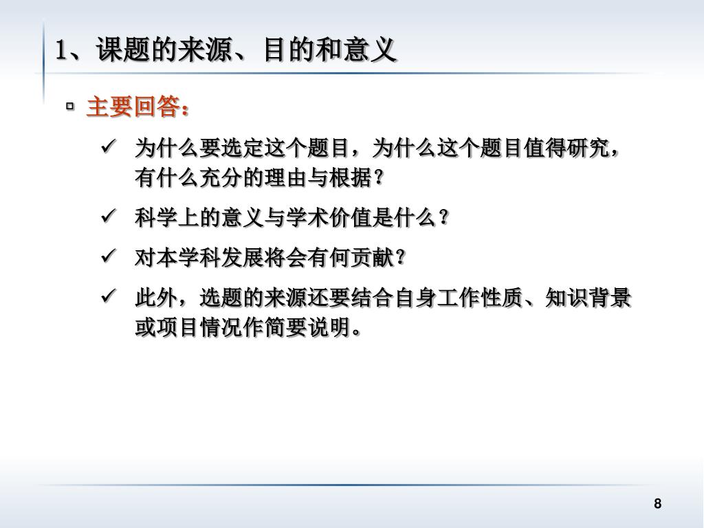 1、课题的来源、目的和意义 主要回答: 为什么要选定这个题目,为什么这个题目值得研究,有什么充分的理由与根据? 科学上的意义与学术价值是什么? 对本学科发展将会有何贡献? 此外,选题的来源还要结合自身工作性质、知识背景或项目情况作简要说明。