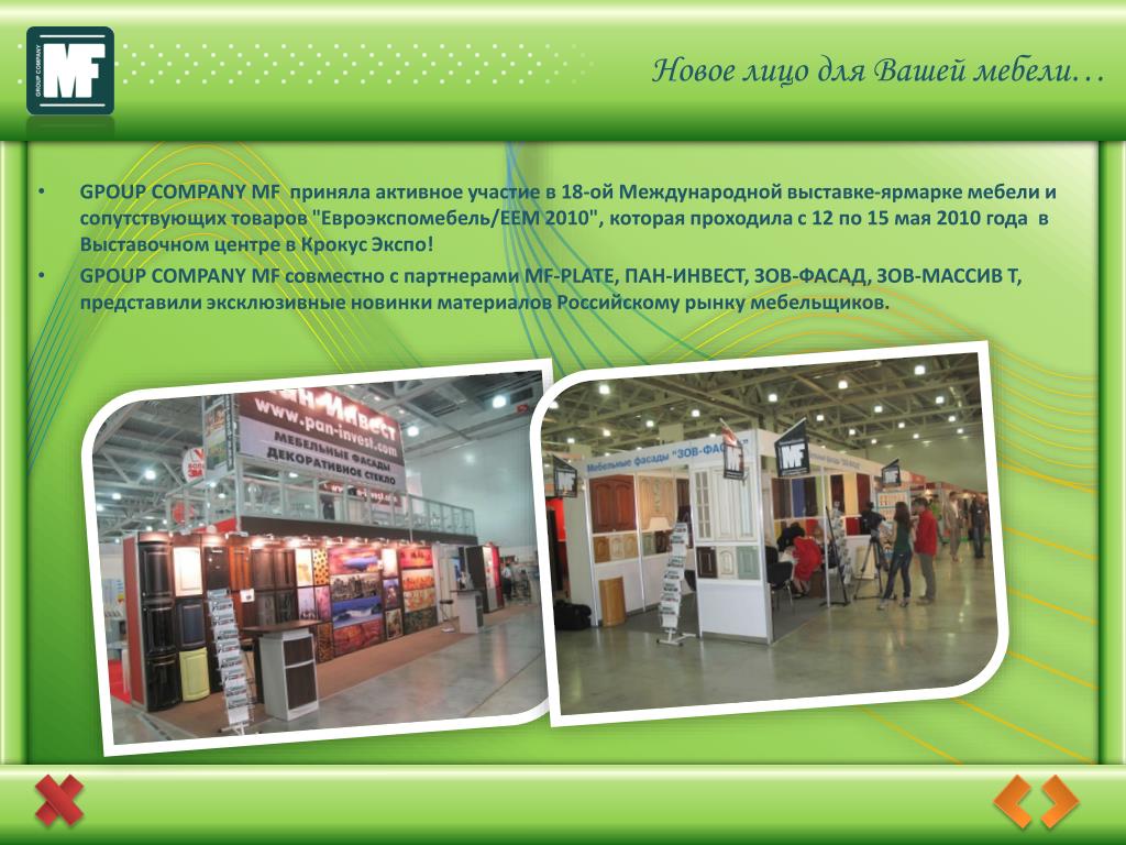 Новое лицо для Вашей мебели… • GPOUP COMPANY MF приняла активное участие в 18-ой Международной выставке-ярмарке мебели и сопутствующих товаров "Евроэкспомебель/ЕЕМ 2010", которая проходила с 12 по 15 мая 2010 года в Выставочном центре в Крокус Экспо! • GPOUP COMPANY MF совместно с партнерами MF-PLATE, ПАН-ИНВЕСТ, ЗОВ-ФАСАД, ЗОВ-МАССИВ Т, представили эксклюзивные новинки материалов Российскому рынку мебельщиков.