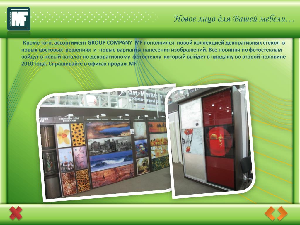Новое лицо для Вашей мебели… Кроме того, ассортимент GROUP COMPANY MF пополнился: новой коллекцией декоративных стекол в новых цветовых решениях и новые варианты нанесения изображений. Все новинки по фотостеклам войдут в новый каталог по декоративному фотостеклу который выйдет в продажу во второй половине 2010 года. Спрашивайте в офисах продаж MF.