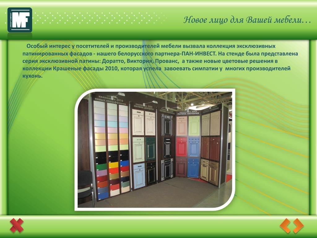 Новое лицо для Вашей мебели… Особый интерес у посетителей и производителей мебели вызвала коллекция эксклюзивных патинированных фасадов - нашего белорусского партнера-ПАН-ИНВЕСТ. На стенде была представлена серия эксклюзивной патины: Доратто, Виктория, Прованс, а также новые цветовые решения в коллекции Крашеные фасады 2010, которая успела завоевать симпатии у многих производителей кухонь.