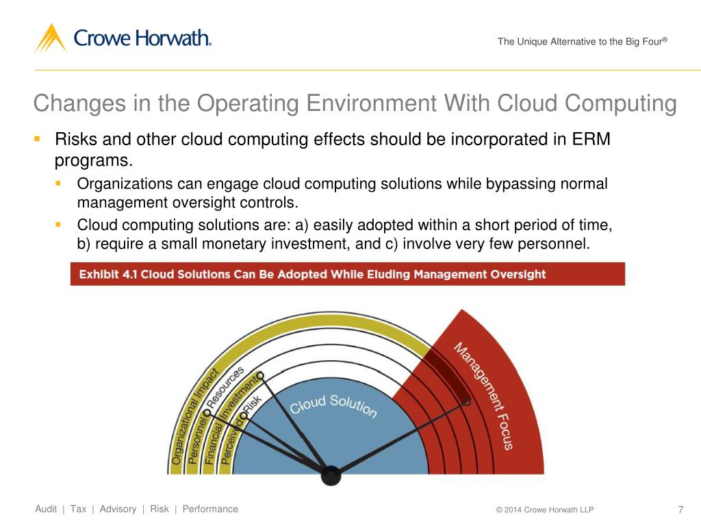 Changes in the Operating Environment With Cloud Computing • Risks and other cloud computing effects should be incorporated in ERM programs. • Organizations can engage cloud computing solutions while bypassing normal management oversight controls. • Cloud computing solutions are: a) easily adopted within a short period of time, b) require a small monetary investment, and c) involve very few personnel.