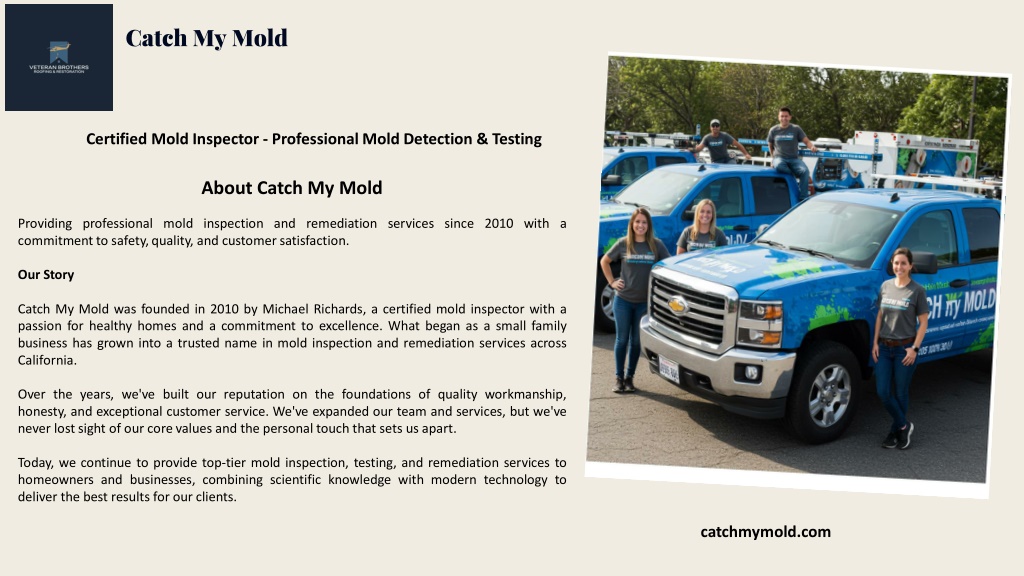 Catch My Mold Certified Mold Inspector - Professional Mold Detection & Testing About Catch My Mold Providing professional mold inspection and remediation services since 2010 with a commitment to safety, quality, and customer satisfaction. Our Story Catch My Mold was founded in 2010 by Michael Richards, a certified mold inspector with a passion for healthy homes and a commitment to excellence. What began as a small family business has grown into a trusted name in mold inspection and remediation services across California. Over the years, we've built our reputation on the foundations of quality workmanship, honesty, and exceptional customer service. We've expanded our team and services, but we've never lost sight of our core values and the personal touch that sets us apart. Today, we continue to provide top-tier mold inspection, testing, and remediation services to homeowners and businesses, combining scientific knowledge with modern technology to deliver the best results for our clients. catchmymold.com
