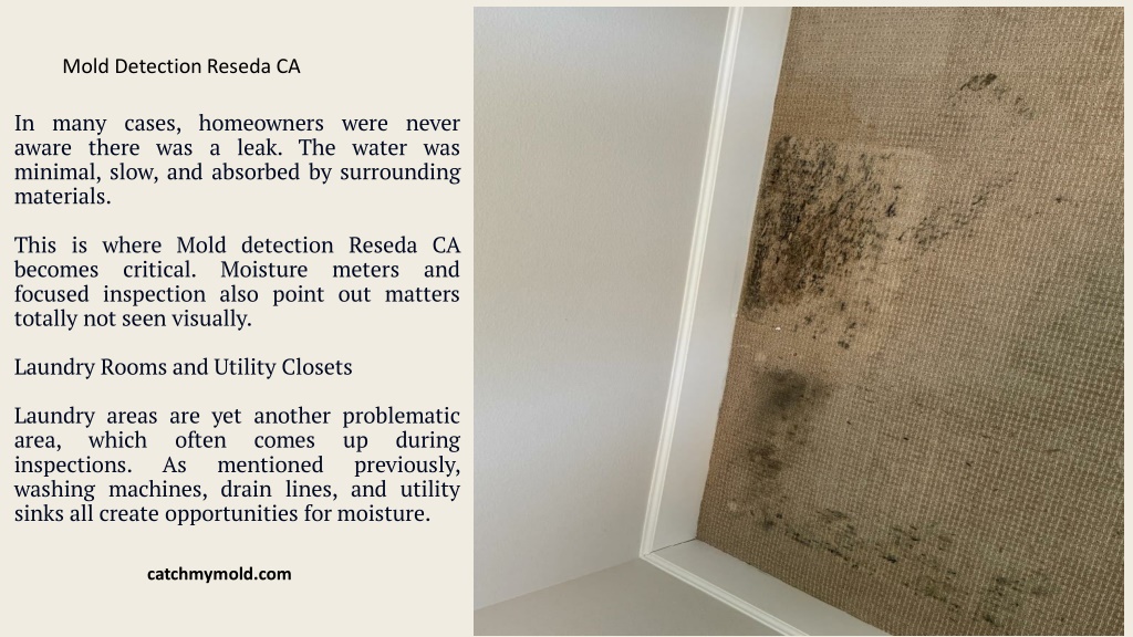 Mold Detection Reseda CA In many cases, homeowners were never aware there was a leak. The water was minimal, slow, and absorbed by surrounding materials. This is where Mold detection Reseda CA becomes critical. Moisture meters and focused inspection also point out matters totally not seen visually. Laundry Rooms and Utility Closets Laundry areas are yet another problematic area, which often inspections. As mentioned washing machines, drain lines, and utility sinks all create opportunities for moisture. comes up previously, during catchmymold.com