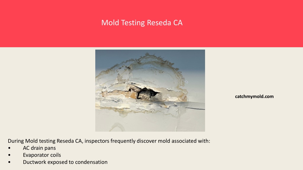 Mold Testing Reseda CA catchmymold.com During Mold testing Reseda CA, inspectors frequently discover mold associated with: • AC drain pans • Evaporator coils • Ductwork exposed to condensation