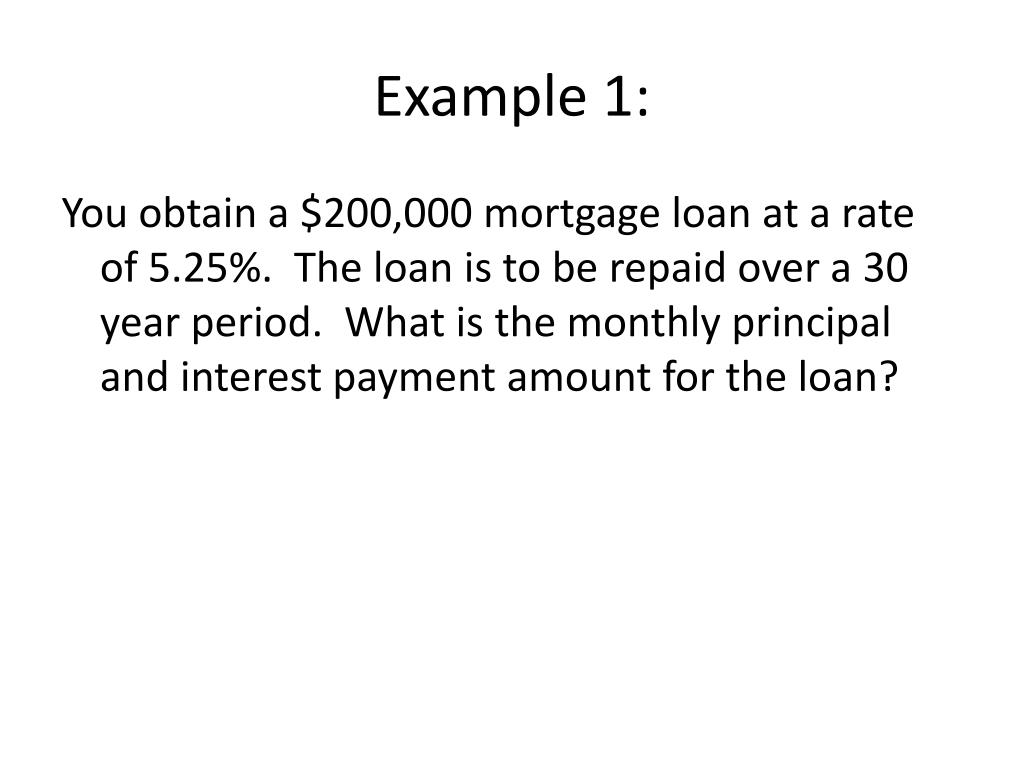 Example 1: You obtain a $200,000 mortgage loan at a rate of 5.25%. The loan is to be repaid over a 30 year period. What is the monthly principal and interest payment amount for the loan?