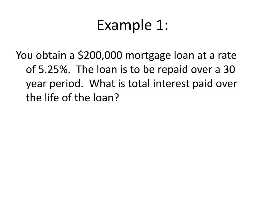 Example 1: You obtain a $200,000 mortgage loan at a rate of 5.25%. The loan is to be repaid over a 30 year period. What is total interest paid over the life of the loan?