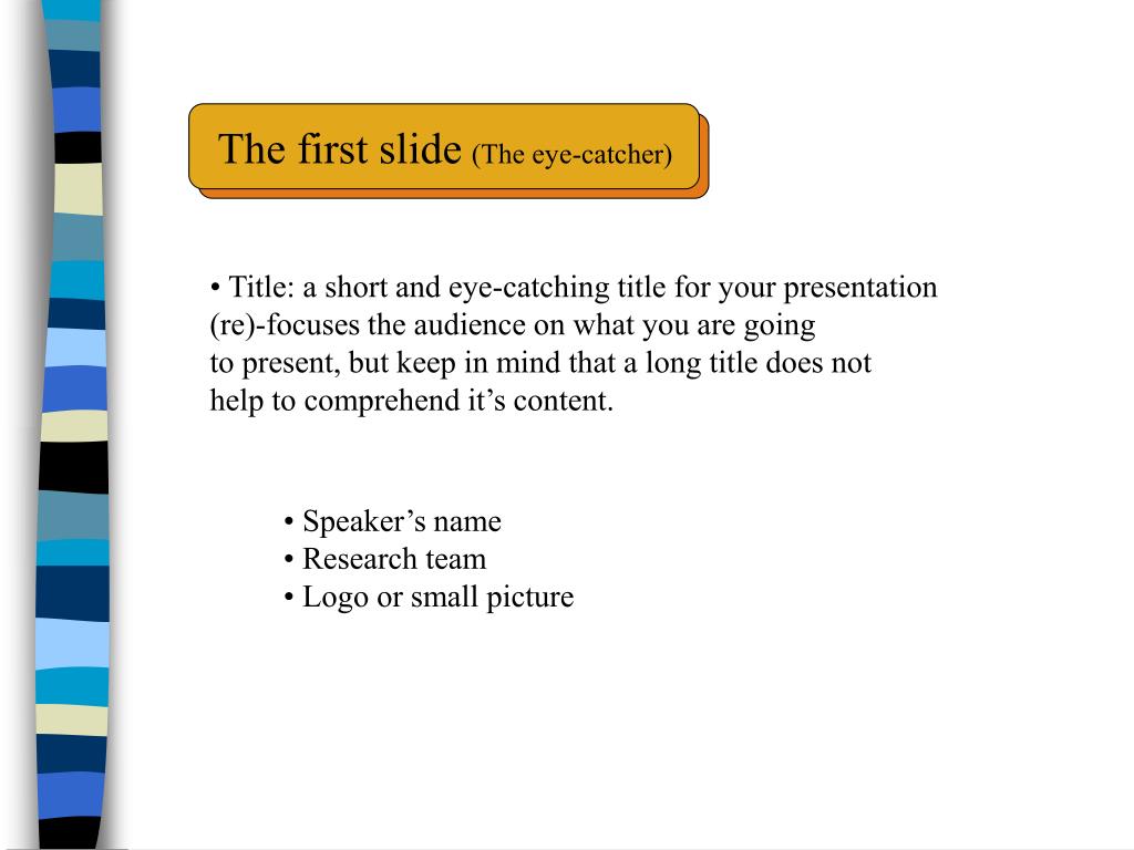 The first slide(The eye-catcher) • Title: a short and eye-catching title for your presentation (re)-focuses the audience on what you are going to present, but keep in mind that a long title does not help to comprehend it’s content. • Speaker’s name • Research team • Logo or small picture