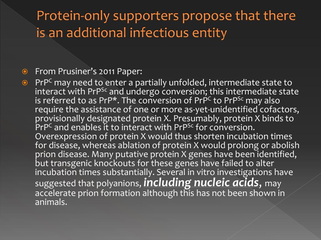 Protein-only supporters propose that there is an additional infectious entity • From Prusiner’s 2011 Paper: • PrPC may need to enter a partially unfolded, intermediate state to interact with PrPSc and undergo conversion; this intermediate state is referred to as PrP*. The conversion of PrPC to PrPSc may also require the assistance of one or more as-yet-unidentified cofactors, provisionally designated protein X. Presumably, protein X binds to PrPC and enables it to interact with PrPSc for conversion. Overexpression of protein X would thus shorten incubation times for disease, whereas ablation of protein X would prolong or abolish prion disease. Many putative protein X genes have been identified, but transgenic knockouts for these genes have failed to alter incubation times substantially. Several in vitro investigations have suggested that polyanions, including nucleic acids, may accelerate prion formationalthough this has not been shown in animals.