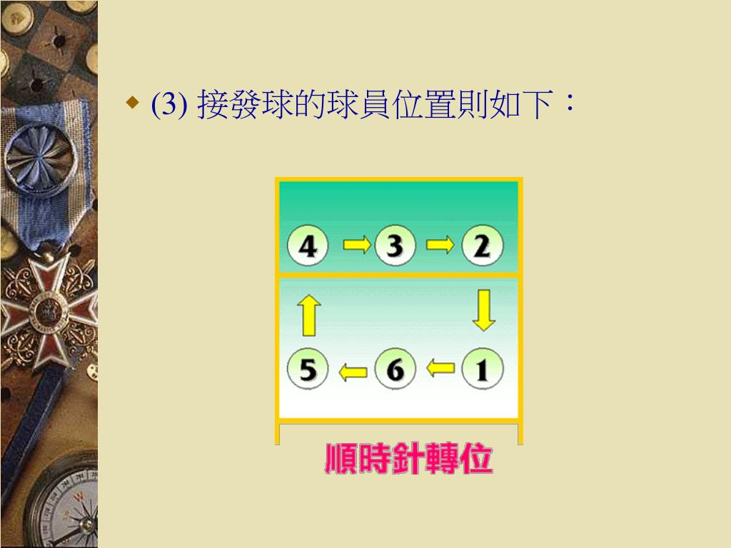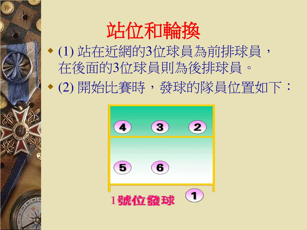 站位和輪換 • (1) 站在近網的3位球員為前排球員,在後面的3位球員則為後排球員。 • (2) 開始比賽時,發球的隊員位置如下: