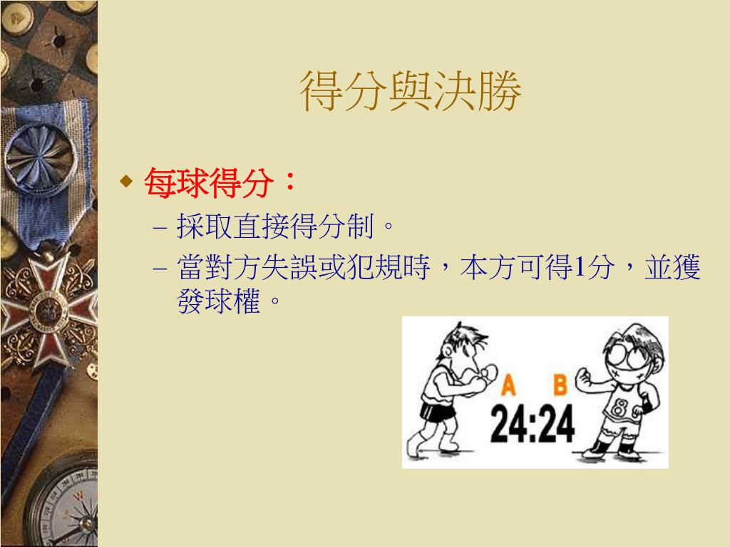 得分與決勝 • 每球得分: • 採取直接得分制。 • 當對方失誤或犯規時,本方可得1分,並獲發球權。