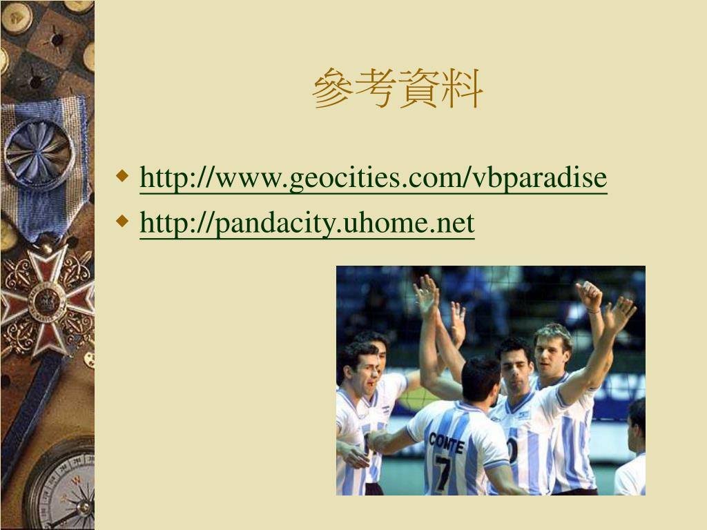參考資料 • http://www.geocities.com/vbparadise • http://pandacity.uhome.net