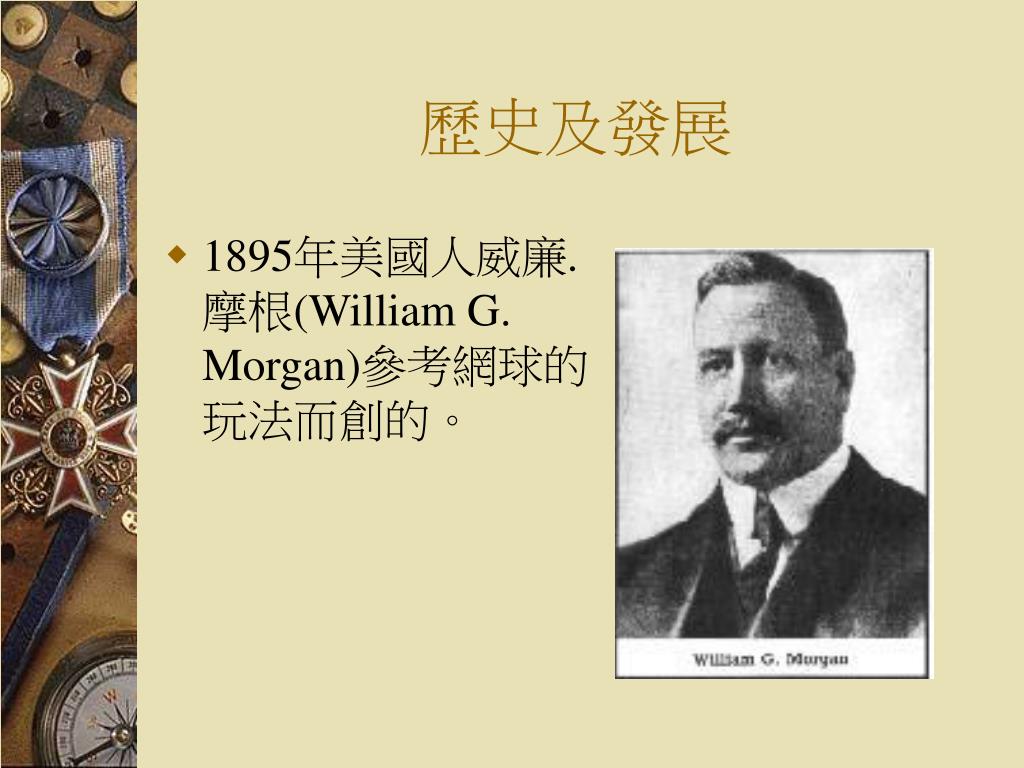 歷史及發展 • 1895年美國人威廉.摩根(William G. Morgan)參考網球的玩法而創的。