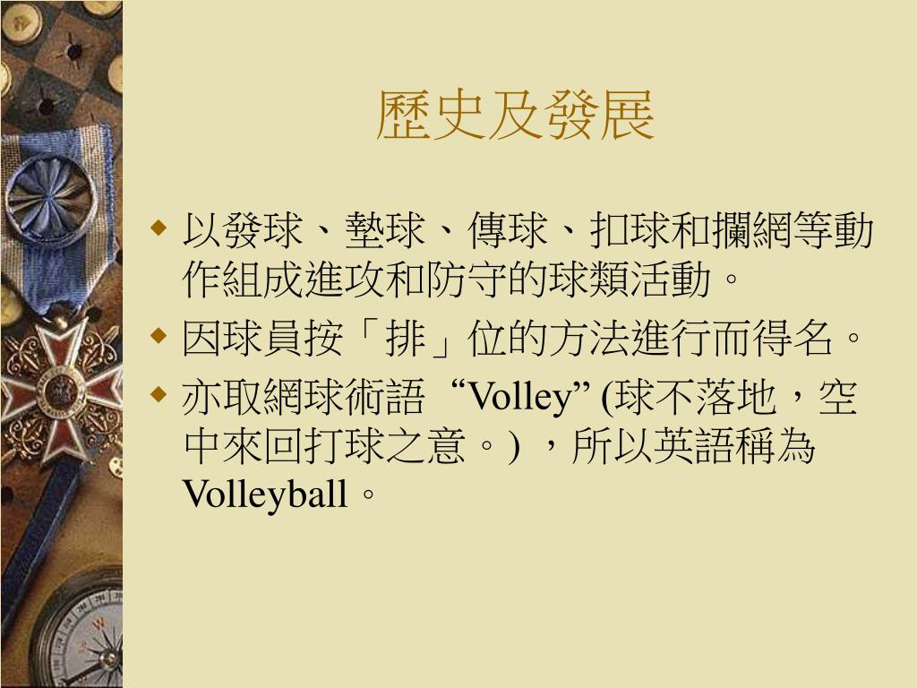 歷史及發展 • 以發球、墊球、傳球、扣球和攔網等動作組成進攻和防守的球類活動。 • 因球員按「排」位的方法進行而得名。 • 亦取網球術語“Volley” (球不落地,空中來回打球之意。) ,所以英語稱為Volleyball。