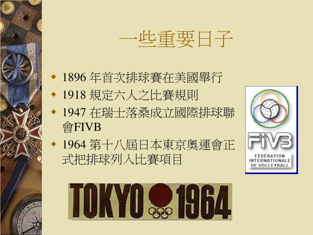 一些重要日子 • 1896 年首次排球賽在美國舉行 • 1918 規定六人之比賽規則 • 1947 在瑞士落桑成立國際排球聯會FIVB • 1964 第十八屆日本東京奧運會正式把排球列入比賽項目