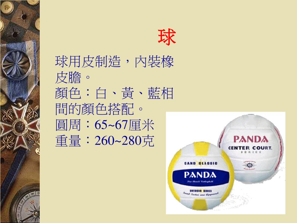 球 球用皮制造,內裝橡皮膽。 顏色:白、黃、藍相間的顏色搭配。 圓周:65~67厘米 重量:260~280克