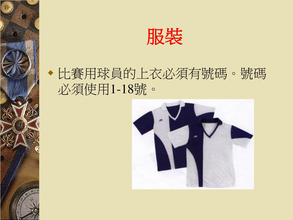 服裝 • 比賽用球員的上衣必須有號碼。號碼必須使用1-18號。